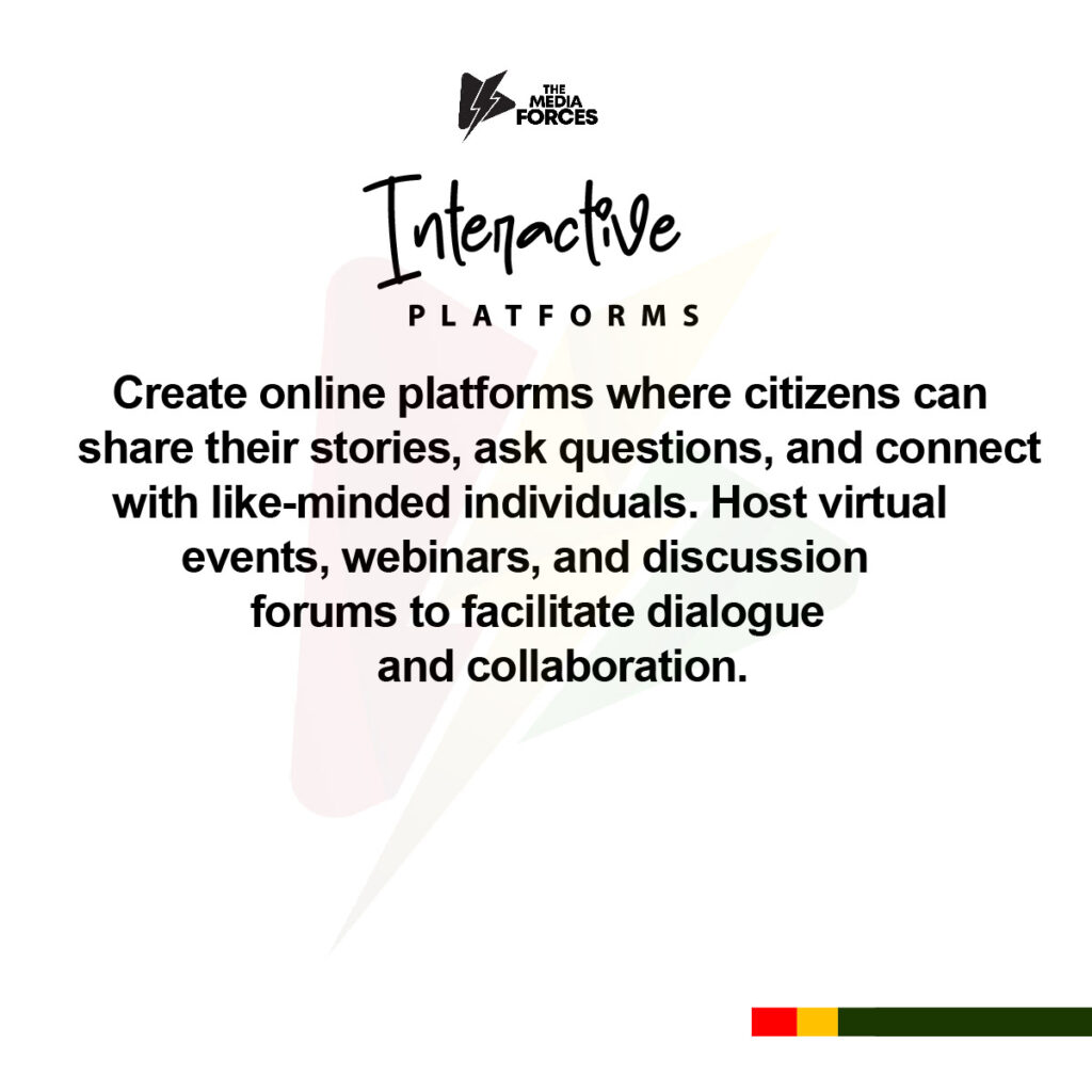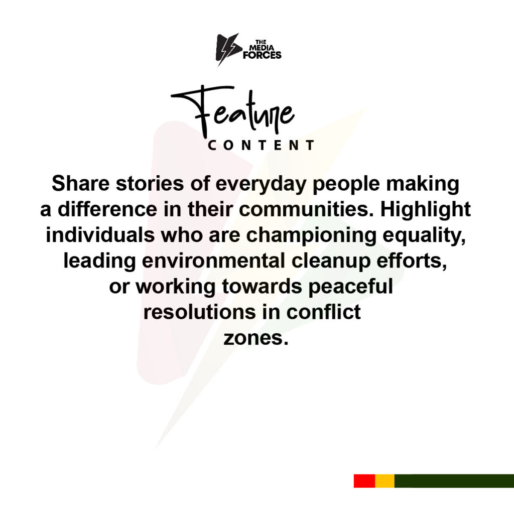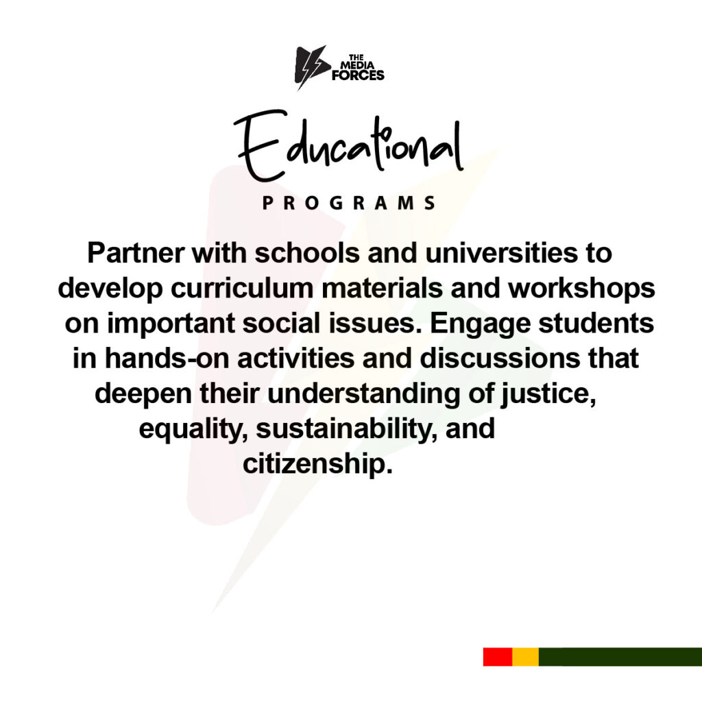 The Media Forces is dedicated to promoting Equality, Justice, Patriotism, Development, Freedom, and Sustainability, our functions encompass strategic leadership, stakeholder engagement, resource management, innovation, and advocacy. Our overarching goal is to serve as a catalyst for positive social change, leveraging media to inform, inspire, and empower individuals and communities. Our mission is to foster a more inclusive, just, and prosperous Ghana by raising awareness of social issues, fostering civic engagement, celebrating national pride, driving sustainable development, and safeguarding press freedom. To achieve these goals, we collaborate with like-minded organizations, measure our impact, and uphold the highest ethical standards in our journalism and operations. Our objective is to be a trusted source of information and a force for positive change, driving social progress and contributing to a more equitable and sustainable Country.